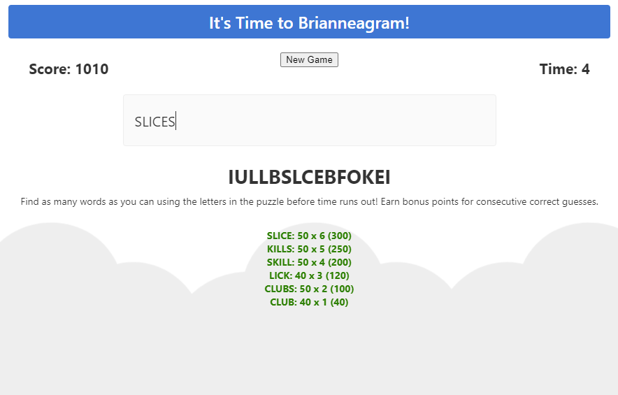 But what kind of word game? I wanted something quick and simple that could be played any time she had a spare minute, but with enough depth to keep her engaged on the couch on a Sunday afternoon. I decided on a simple anagram style game. Given a series of letters, find as many English words as possible that can be made from them. Add a 1 minute timer for a little pressure, and a score multiplier to incentivize careful guesses and “Brianneagram” was born.